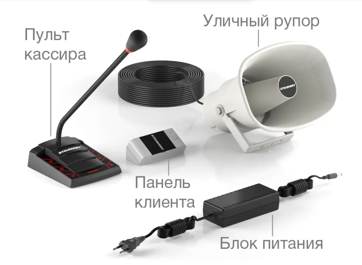 пульт кассира с функцией громкого оповещения, панель клиента, угловое крепление панели клиента, набор проводов и крепежа, заглушки для панели клиента, блок питания на 48 Вольт, рупорный громкоговоритель STELBERRY F-415 с 15 метрами уличного кабеля, а также инструкция по установке и эксплуатации.