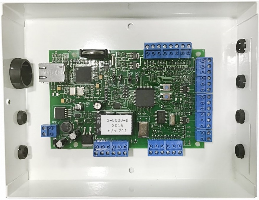 Контроллер GATE-8000-Ethernet – электронный модуль, предназначенный для управления доступом в жилые и производственные помещения, учета времени прохода и событий. Контроллер имеет два входа для подключения считывателей. В штатном исполнении контроллер работает со считывателями, имеющими выходной интерфейс Wiegand-26 или 48(автомат). Опционально доступны к заказу версии контроллера с возможностью подключения считывателей с интерфейсом «1-Wire» (TM), «АВА-2» (для считывателей магнитных карт). Контроллер обрабатывает информацию, поступающую со считывателя, и с помощью встроенного реле осуществляет коммутацию исполнительного устройства (например, замка). Наличие двух дополнительных входов позволяет круглосуточно контролировать две охранные зоны (без контроля по току). Контроллер может работать как автономно, так и в составе сети. В контроллере предусмотрена функция автономного программирования для его настройки пользователем на работу с кодовыми ключами. Контроллер поддерживает режим «Free Logic» - возможность управления выхода- ми по событиям, фиксируемым контроллером. Это означает, что при возникновении любого события можно произвести включение или выключение (временное или постоянное) одного из выходов контроллера, а также можно включить или выключить режим «постоянно-открыто» (режим, при котором оба реле контроллера постоянно включены). Настройка режима «Free Logic» производится с помощью программного обеспечения.