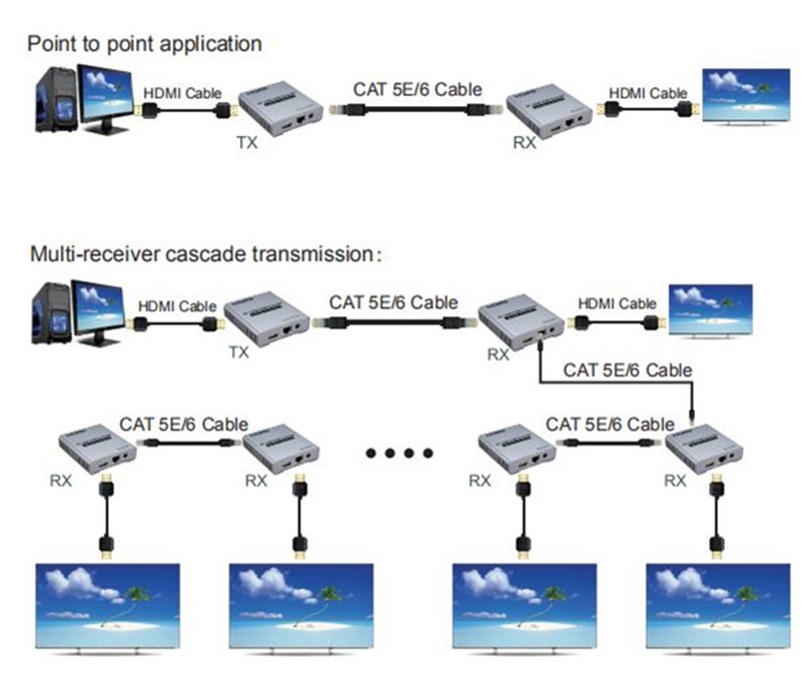Комплект состоит из передающего (TX) и принимающего (RX) блоков, позволяет передавать HDMI-сигнал Ultra HD 4K на расстояние до 120 метров. Также передается инфракрасный сигнал управления, что дает возможность управлять пультом от телевизора, находясь как у приёмника, так и у передатчика